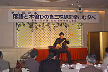 夜は、「彩の国文化・芸術を楽しむ会」主催による、第1回企画「落語と木曽ひのき三味線を楽しむ夕べ」が開催されました。 80名のお客様に来ていただき、野村深山氏の味わい深い三味線の音色を楽しみ、林家たい平師匠の落語では爆笑につぐ爆笑でした。