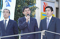 まず、大宮駅東口で行い、午後1時よりは、大宮駅西口で行いました。これには、今春のさいたま市議選で党の公認を受け要諦候補者となっている西区の「上三信(うえさんのぶ)あきら」さんと見沼区の「こしみず恵一」さんも参加いたしました。