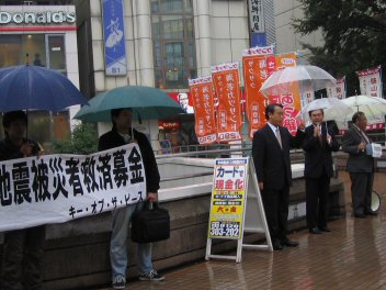 午後1時から2時過ぎまで、公明党さいたま総支部議員団として、青年ボランティア「キー・オブ・ピース」の皆さんに協力し、「新潟県中越地震被災者救援募金」活動を行いました。私は、総支部長として長沢広明衆議院議員とともに、実施した大宮駅西口・東口および浦和駅西口を回らせていただきました。それぞれの駅頭で訴えさせていただきましたが、雨の中、本当に多くの方がご協力していただきました。私の募金箱に寄付金を入れてくださった若い女性は、「兄が新潟にいるので」とおっしゃっていました。幸い、被害に遭われていないようですが、おひとりおひとりのドラマを感じさせていただいた、貴重な時間でした。お預かりした貴重なお金は、11月1日に埼玉新聞社に届け、社を通して現地に届けていただいくことになっております。ご協力いただいた皆様、本当にありがとうございました。
